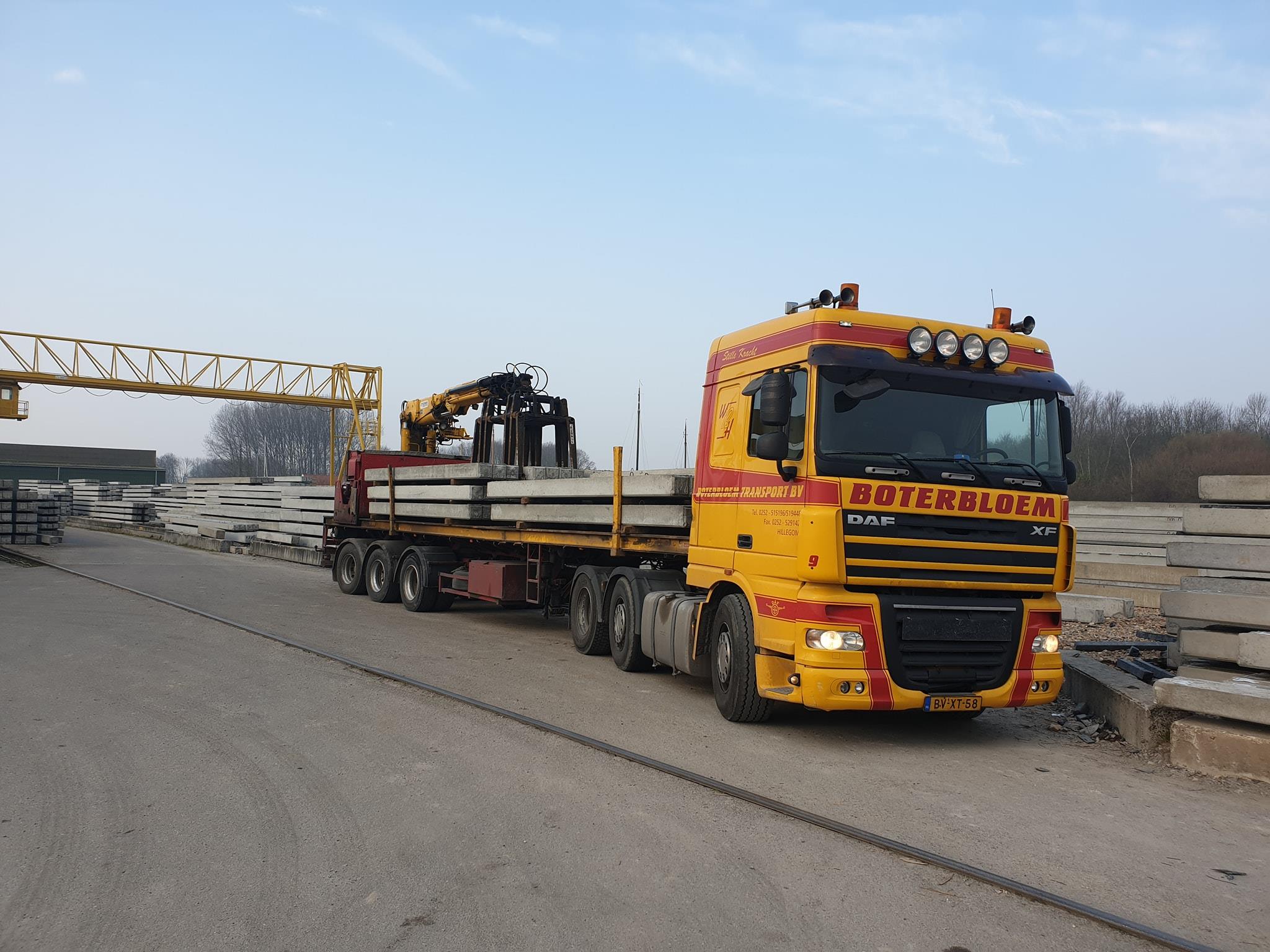Al meer dan 60 jaar transport van heipalen, funderingsbalken, prefab wanden, beton, breedplaatvloeren en prefab elementen, wel of niet zelfgelost door zware laad/los kranen op de vrachtauto . Boterbloem Transport BV beschikt over 25 trekkende eenheden die zo’n 2 miljoen kilometer per jaar afleggen, binnen de Benelux. Tevens beschikken wij over lange uitschuif-trailers evt. met bokken, prefabbeton inladers, en zware laad/los kranen t/m 80 ton meter. Het transport van bouwmaterialen, word uitgevoerd voor kwalitatief en betrouwbare beton producenten. Het grote voordeel van Boterbloem Transport BV, is het juiste materiaal met de juiste chauffeur, dat maakt samen de perfecte combinatie die gewend zijn om op de bouwplaats hun werkzaamheden voor 100% uit te kunnen voeren. Voor elke klus bel Boterbloem Transport BV dus!! Of het nu hoog, breed of lang is, de auto’s van Boterbloem Transport BV staan er klaar voor.
